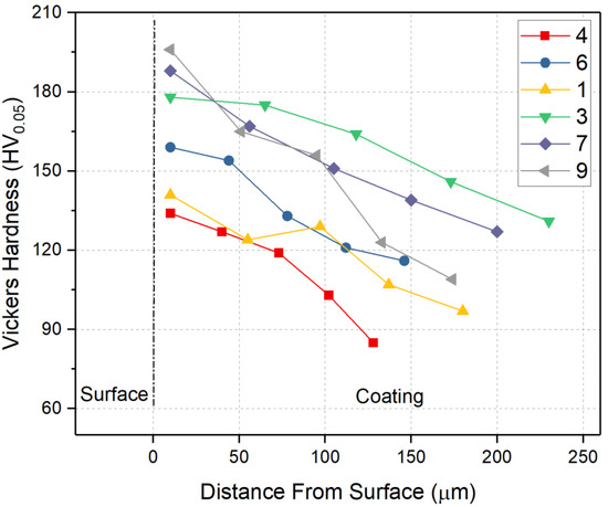 Micro Vickers hardness (HV0.05) profiles from the cross-sections of coatings are shown in Figure 10. It could be simply understood that materials are harder on the surfaces of coatings, as described earlier on microstructure analysis. The surface of the mechanically alloyed particles gets harder with the continuous impact of the grinding balls. Inner parts of the coatings will be exposed to this impact energy to a lesser degree till the substrate-coating interface. When the profiles are analyzed, the softest coating is the fourth sample, while the ninth sample has the hardest surface. The fourth sample remains the softest on the interface, but the third sample has become the hardest. The amount of reduction on the hardness profiles of coatings using balls with 10-mm diameter (the first and third specimens) is smaller than coatings produced with 5-mm balls. Higher impact and sliding energy input of larger grinding balls result in a more homogeneous distribution of structure (Figure 4), and therefore hardness profiles of coatings become more stable toward the interface.