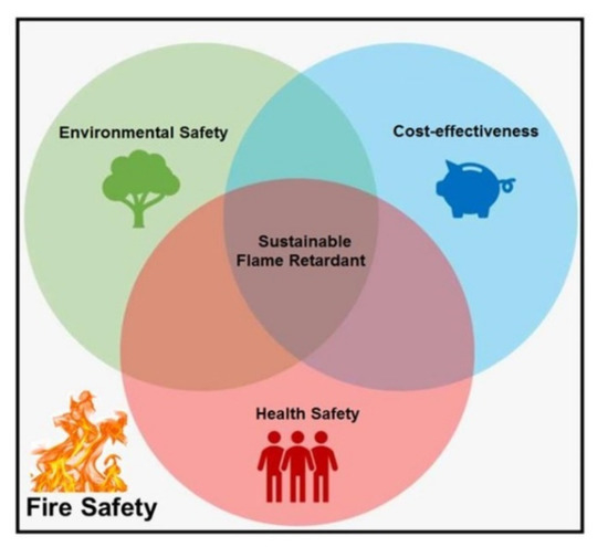 From the sustainability point of view, the use of biowaste materials in flame retardant systems can be considered as a promising solution to plastic disposal and biowaste landfill, mainly due to the availability and low cost of biowastes. So far, several biowastes have been incorporated as flame retardants into several polymers, including “oyster shell powder” in polypropylene [8], polyurethane [9], polyethylene [10], and acrylonitrile-butadiene-styrene copolymer (ABS) [11], “eggshell” in ethylene-vinyl acetate copolymer (EVA) [12] and for intumescent coating system [13], and “rice husk” in epoxy [14]. Sustainable flame retardants are at the core of attention in view of providing environmental safety, cost-effectiveness, and health safety considerations (Figure 2). Nevertheless, finding industrial biowastes in large quantities that guarantee all aspects of sustainability remains as a debate.