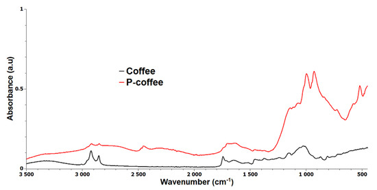 FTIR spectra of untreated (Coffee) and phosphorus treated coffee (P-coffee) samples.