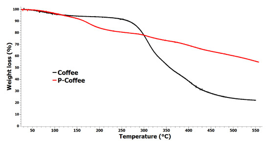 TGA thermograms of unmodified coffee biowaste (Coffee) and coffee biowaste modified with phosphorus (P-coffee) under nitrogen at 10 °C·min−1.