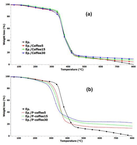 TGA thermograms of epoxy and epoxy composites containing various amounts of unmodified coffee biowaste (Coffee); (a) those of coffee biowaste modified with phosphorus (P-coffee) (b).