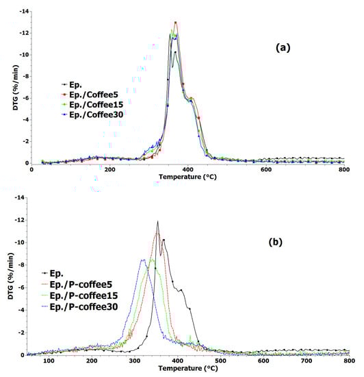 For samples containing Coffee (Figure 7a), the thermal decomposition mechanism of epoxy remained almost unaffected, while above 500 °C, composite samples show improved thermal stability. For samples containing P-coffee (Figure 7b), however, decomposition started at a lower temperature with respect to the neat epoxy; the more the P-coffee amount the higher the rate of thermal decomposition. At higher temperatures (above 450 °C), composites obviously have higher thermal stability compared to epoxy and systems containing Coffee, seen in Figure 7a. In Table 3, T5 and T10 are temperatures at which 5% and 10% weight loss takes place, respectively. T10 vividly increased from 314 °C for neat epoxy to 326 °C for Ep./Coffee15 sample. Overall, composites were not thermally stable and roughly degraded up to 800 °C. The residue at 800 °C were 4.5, 7.5, and 9.5% for epoxy composites containing 5, 15, and 30 wt.% Coffee, respectively. For instance, the value of T10 for Ep./P-coffee30 sample was 250 °C, while it was 314 °C for the neat epoxy. It can be concluded that stabilization of char was observed after 428 °C and all composites showed improved thermal stability compared with the neat epoxy. The remaining residue at 800 °C was 13, 16.5, and 22.5% for epoxy composites containing 5, 15, and 30 wt.% P-coffee, respectively. This suggests the effectiveness of phosphorus modification of coffee biowastes. Derivative thermogravimetric (DTG) curves of epoxy and epoxy composites containing Coffee and P-coffee are also shown in Figure 8a,b. It demonstrates that the main degradation steps of all samples containing unmodified coffee biowaste (Figure 8a) occurs between 280 °C and 470 °C. The presence of modified coffee waste at 15 wt.% and 30 wt.% of loading led to decrease of Tmax (temperature, at which sample lost maximum of its weight). Tmax of pure epoxy and Ep./P-coffee5 was 353 °C, while it was 341 °C and 318 °C for Ep./P-coffee15 and Ep./P-coffee30, respectively.