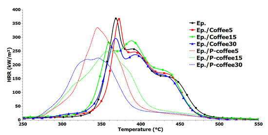 From Figure 9, two different flammability behaviors are observed for composite samples containing Coffee or P-coffee. For all composites containing Coffee, the curve of HRR initiated around 325 °C, which was more similar to that of neat epoxy. Then, a sharp increase in HRR was observed, before reaching the pHRR. A completely different behavior was observed for samples containing P-coffee, where HRR curves followed a moderate ascending trend in the vicinity of 275 °C. A moderate slope compared with those of the composites containing Coffee was also seen, which ended in pHRR rise and then fall around 420 °C. Such early-stage variation in HRR curves can be explained on account of phosphorous chemical used in treatment of coffee biowaste.