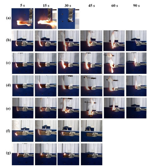Snapshots taken from videos showing the evolution of flame propagation as a function of time in a horizontal flame test configuration; (a) Ep., (b) Ep./Coffee5, (c) Ep./Coffee15, (d) Ep./Coffee30, (e) Ep./P-coffee5, (f) Ep./P-coffee15, (g) Ep./P-coffee30.