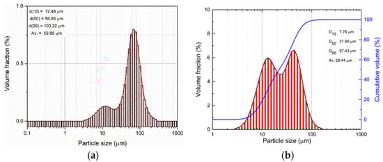 Figure 1a,b displays the differential and cumulative volume percentages of the particle size distribution Ti3AlC2. As can be observed in Image 1a, the feedstock powder distribution is bimodal and polydisperse with the average particles size between 10 and 100 µm, with an average size of 60 μm. After sieving the coarser constituents were removed and the average dimension of the particle is around 30 µm (Figure 1b).