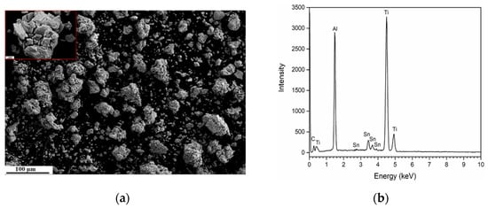 As displayed in Figure 2, the particles exhibit both a coarse and fine lamellar structure, comprising a mix of smaller and larger particles. Some of the particles already show deformation, cracks, and fracture sites along with internal laminates. The EDS spectra reveal the presence of tin (Sn), which was probably introduced as a phase stabilizer in the Ti-Al-C system, to obtain single-phase Ti3AlC2 and to prevent the impurity formation.