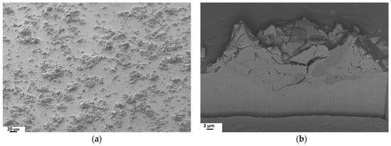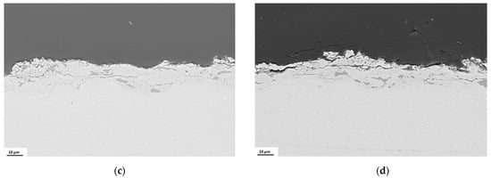 The ceramic character will be more accentuated with the increase of particle velocity, as the next layer is constructed (Figure 11a–d). The particle–particle interaction follows the first layer topography. The adhesion between the first and second layer presents horizontal inter-splat cracks, produced by the absence of adhesion between particles through the deposition process. This elongated porosity is common to ceramic thermal spray deposition []. Further build-up layers are limited by the transversal cracks, and the incoming particles will erode or rebound. Therefore, the coating thickness is restricted to less than ~50 µm. The gas temperature enhances the powder particles’ thermal input, slightly increasing the growth of cohesive coatings.