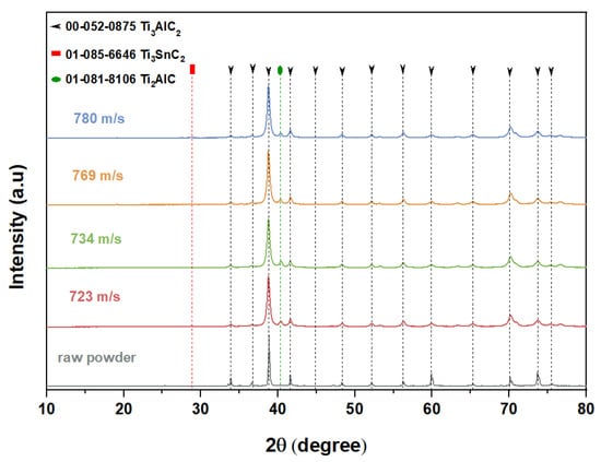 XRD patterns of the Ti3AlC2 feedstock powder and coatings were obtained at different particle velocities in the CS process.
