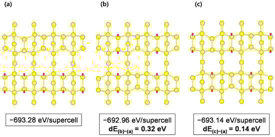 Density functional theory (DFT) calculation results describing most probable hydrogen configurations on top-layer of the H-50% covered Si(001) surface. Configuration (a): all adsorbed hydrogens are in close to each other. Configuration (b,c): all of the two closest hydrogens are far away from the other two closest hydrogens.
