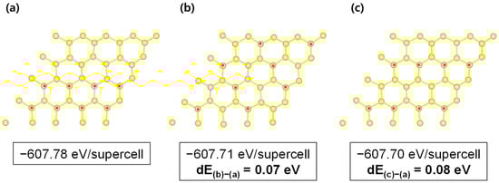In this study, all DFT calculations were carried out using the Vienna ab initio simulation package (VASP) program with the Perdew-Burke-Ernzerhof (PBE) functional in the generalized gradient approximation (GGA) [,]. Details of DFT calculations were provided in our previous report []. We searched for the most probable hydrogen configurations (see Figure 1 and Figure 2) in the top layer of the H-50% covered Si(001) and H-50% covered Si(111) surfaces. Thus, the H-50% covered Si(001)-(4 × 4) and H-50% covered Si(111)-(4 × 4) surfaces were employed (see Figure 3 and Figure 4) to reduce the molecular interactions between the inter-unit cells by using a cell size twice as large as that of (4 × 2). Each slab consists of six atomic layers for all Si surfaces. As shown in Figure 3 and Figure 4, we considered two geometries and 10 positions for the Si2H6 on the H-50% covered Si(001) surface, whereas for the H-50% covered Si(111) surface, we used two geometries for Si2H6 together with six positions. The complete details of these cases are available in Electronic Supplementary Information (ESI).