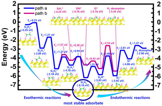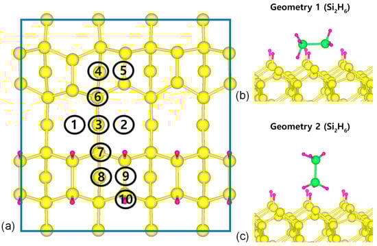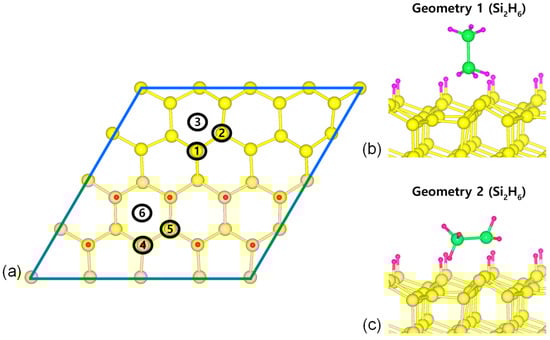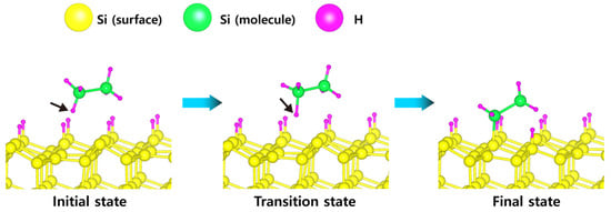 Hydrogenated silicon thin films (Si:H) are often deposited on Si substrates by PECVD []. Despite its long history of development, the PECVD of hydrogenated silicon is still considered a challenging area of research. In industrial applications, Si:H thin films are mainly deposited using the SiH4-based plasmas [,]. It is worthy to note that, in the plasma deposition process, optimization of the process window is often achieved under conditions of higher gas pressures (pg) [,]. For example, Isomura et al. [] experimentally explored the feasibility of the high-pressure regime in the plasma silicon deposition. In the meantime, at higher gas pressure, SiH4-based plasma generates Si2H6 to a non-negligible degree. Si2H6 can be directly adsorbed onto Si surfaces to form SiHx species. This leads to the growth of a Si:H thin film with the release of H2 gas. Based thereupon, in several previous reports, it was observed that the Si2H6 adsorption promotes the Si:H deposition efficiency [,]. Thus, in-depth comprehension of the surface adsorption of Si2H6 at the atomic scale is required [,]. To achieve this purpose, in our previous study [], it was theoretically investigated that Si2H6 on the clean Si(001) surface is the most efficient in deposition of Si:H thin films among SiH4 on the clean Si(001), Si2H6 on the clean Si(001), SiH4 on the clean Si(111) and Si2H6 on the clean Si(111).
