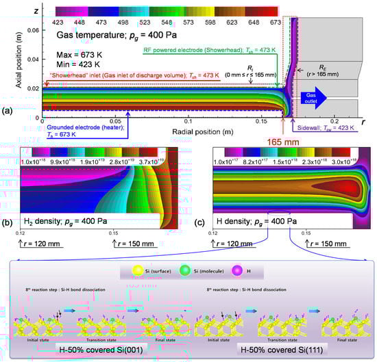 The following input conditions were specified for all cases: the SiH4 flow rate was set to 50 sccm, the He flow rate was set to 5000 sccm, the input power was set to 100 W, the electrode spacing (d) was set to 15 mm and the temperatures of the showerhead (Tsh), sidewall (Tsw) and heater (Ts) were set to 473 K, 423 K and 673 K, respectively. The spatial variation in the gas temperature (Tg) is depicted in Figure 5a. Finally, Figure 5b,c show that H2 and H densities are spatially altered, respectively.
