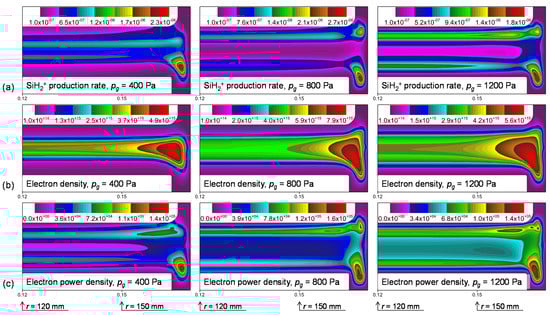In Figure 10a, the ionization reaction [the production of SiH2+: e− + SiH4 → SiH2+ + H + H + e− + e−] rate profiles for the cases of pg = 400 Pa, pg = 800 Pa and pg = 1200 Pa are depicted. For the cases of pg = 400 Pa and pg = 800 Pa, the ionization rates are significantly enhanced near the respective edges of both the showerhead and the heater. However, the ionization rate profile obtained by further increasing the gas pressure to pg = 1200 Pa clearly shows that the peak ionization rates are noticeably lower near the electrode edges, and its radial distribution becomes relatively more uniform in both the radial and axial directions.