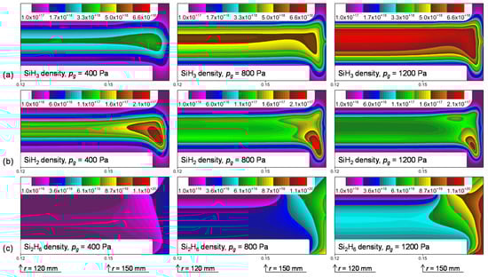 Figure 11 shows the spatial variations in the densities (m−3) of SiH3, SiH2 and Si2H6 when the gas pressure is increased from 400 Pa to 1200 Pa. In Figure 11a, since at higher pressure, more electrons are generated (Figure 10b), and a larger amount of power is transferred to electrons (Figure 10c). As a result, more radicals are generated: the SiH3 density increases in the bulk and its off-axis maximum is also enhanced. However, despite the pressure increasing threefold (i.e., pg increases from 400 Pa to 1200 Pa), the SiH3 density does not increase as much as expected. This saturation can be explained by the fact that, in the gas phase, the SiH3 radical is eliminated fast, as shown below: