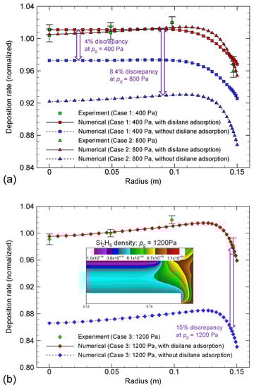 Deposition rates are plotted along the radial direction for pg = 400 Pa (squares), 800 Pa (triangles) and 1200 Pa (diamonds). (a) Deposition rate profiles for pg = 400 and 800 Pa superimposed with the corresponding experimental data. (b) Relative discrepancy of approximately 15% at pg = 1200 Pa between the deposition rates with and without consideration of Si2H6 adsorption.