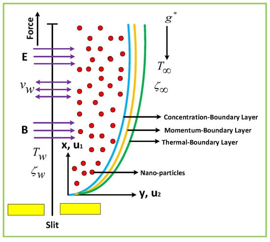 We consider the time-dependent magnetohydrodynamic (MHD) mixed convection,  incompressible electrically conducting, laminar and viscous flow of nano-sized nanoparticles over a stretching sheet, which has been examined in the presence of chemical reaction, Arrhenius activation energy and viscous dissipation. The flow is subjected to the transverse magnetic and electric field strength B and E, which are assumed to be applied in the direction  and normal to the surface (see Figure 1). The magnetic and electric fields follow the law of Ohm’s , where V, J and  represent the velocity of fluid, Joule current and the electrical conductivity, respectively. The Joule (current) effect mentioned also plays roles in the transport of a charged particle in the electromagnetic field []. Since the magnetic Reynolds number is small, the induced magnetic field and Hall current effects are ignored []. The impacts of Stefan blowing has also been considered. Assuming the velocity of the linearly stretching sheet is , the velocity of mass transfer is , where axis and axis are assumed along the stretched sheet and (t) its time. Suppose that the values of the ambient concentration and temperature are symbolized by ( and ), respectively. It is also assumed that the temperature and concentration at the surface has a constant value of  and . Using these assumptions, the boundary layer equations governing the conservation of mass, linear momentums, thermal energy and nanoparticles volume friction in the vector form are as follows: