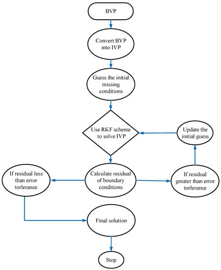 The numerical solution of ordinary differential Equations (12)–(14) with the boundary conditions shown in Equations (15) and (16) has been obtained by using the Runge–Kutta 4th order with the shooting technique (see Figure 2). However, different analytical and numerical methods have been implemented to examine the nonlinearity in the flow process. The most commonly used approximate analysis methods for flow problems include HAM (homotopy analysis method), VPM (variation of parameter method), ADM (Adomain decomposition method), VIM (variational iteration method), etc. However, the Runge–Kutta 4th order is more effective. This method with the shooting technique is a powerful scheme for solving ODEs. The short Runge–Kutta 4th order solves boundary value problems precisely, adequately and rapidly. The Runge–Kutta strategy has been utilized via commercial software, for example, ADINA, ANSYS, ABAQUS, MATLAB and so on. We transformed Equations (12)–(14) into a set of first-order ordinary differential equations (ODEs). For this purpose, we introduced the following variables,