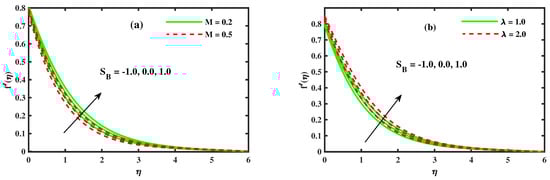 Figure 3a,b describes the effects of the magnetic parameter M, the thermal buoyancy parameter , and the Stefan blowing  on the non-dimensional velocity profile. Figure 3a indicates that the component of velocity reduces with the increasing magnetic field strength. Exposing an electrically conducting nanofluid to a transverse magnetic field causes a surge in a resistance force recognized as a Lorentz force. This force tends to inhibit fluid velocity, and from Figure 3b, it is clear that the momentum of the boundary layer rises with an increase in the . Physically, the given detail is elaborated as to why the velocity profiles rise as more forces are added with these increases in buoyancy parameters . The  shows a rising trend against a higher input of . From this figure, the fluid velocity is intensified for Stefan blowing  as compared with mass suction . The injection of tiny particles (nanoparticles) through the boundary energizes species diffusion, while the evacuation of tiny particles inhibit diffusion, so growing values of blowing increase the fluid velocity. To observe the buoyancy ratio parameter influence and the unsteadiness parameter with the Stefan blowing effects on the dimensionless velocity profile demonstrated in Figure 4a,b. The result shows in Figure 4a that the increasing value of the buoyancy ratio caused to decline fluid velocity, and Figure 4b shows the similar trend against growing strength of unsteadiness parameters. The distribution shows that the thermal diffusion from the sheet surface to the ambient condition prominent over mass buoyancy forces of tiny particles, so the strength of the convection current decrease the fluid velocity.