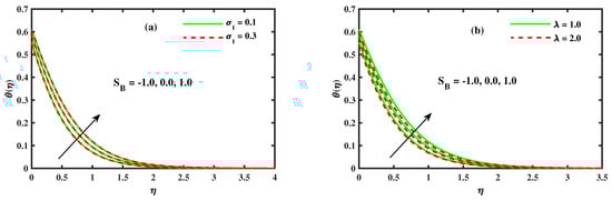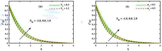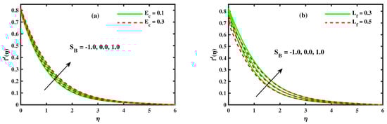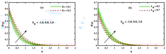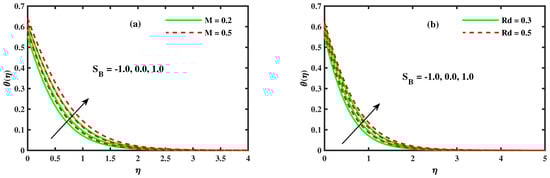 Figure 5a,b shows the impact of the electric field parameter  and hydrodynamic slip parameter  with Stefan blowing  on the non-dimensional velocity profile. The effect of the  has been demonstrated in Figure 5a. As the estimations of electric field parameter increments, the momentum boundary layer increases significantly above the sheet expressively. The electric field associated with Lorentz force, in general, prompt nanomaterial particles stress exchanging the effective viscosity of scattering as well as yield improvement because of energy transformations. Figure 5b shows that the escalation of the slip parameter of velocity causes a reduction in the velocity profile. Figure 6a,b show the results of the nanofluid temperature profile  with distinct values of the , M and . The temperature distribution increases with an increase in M,  and . Since the intensity of M increments in an electrically conducting nanofluid, it starts to create a resistive power (Lorentz power) and nanoparticle dissolves the vitality as heat; therefore, the boundary layer gets thicker (see Figure 6a). The effect of conduction increases against the growing value of radiation, and the fluid temperature raises at each point away from the surface, which intensifies the temperature (see Figure 6b).