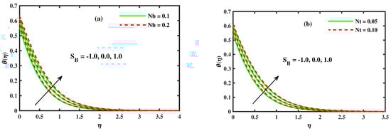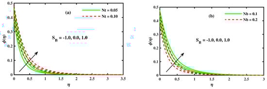 Figure 9a,b demonstrated the distribution of the temperature of distinct values of the Brownian motion parameter , thermophoresis parameter  and with the suction/blowing parameter . The impact of the Brownian motion parameter has been displayed in Figure 9a. Basically, Brownian motion supports heating the fluid in the boundary layer and immediately reduces particle deposition away from the fluid on the surface. Therefore, as  rises, the temperature increases. Figure 9b summarizes the effect of changes in thermophoresis parameters  on the temperature profile. Figure 9b outlines the influence of the variation of the  on the temperature profile. As the thermophoresis parameter surges, the thickness of the thermal boundary layer grows as  increments. In reality, nanoparticles have moved from a hot surface to a cold ambient liquid, so the temperature of the boundary layer rises. This impacts the development of the thermal boundary layer thickness. Figure 10a,b present the behavior of the nanoparticles concentration profile with different values of the thermophoresis parameter , Brownian motion parameter  and Stefan blowing parameter . The impression of the thermophoresis parameter  on the concentration profile (see Figure 10a) is identical to that of the temperature profile  (see Figure 9b). The impact of  on the distribution of the concentration exists in Figure 10b. The concentration profile was diminished because of changes in the uneven development of the nanoparticles in the framework. This reinforces the thermal exhibition as vitality changes hugely, prompting a decrease in the layer thickness.