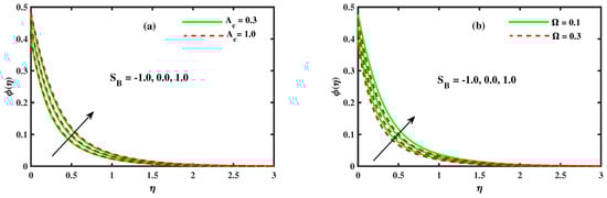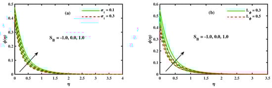 Figure 13a,b demonstrate the behavior of the nanoparticles concentration profile with different values of the Schmidt number Sc, Buoyancy ratio parameter  and Stefan blowing parameter . The Schmidt number Sc impact on the nanoparticle concentration diagram is portrayed in Figure 13a. Expanding the Schmidt number relates to a low Brownian dispersion coefficient, which prompts short entrance profundity for the concentration profile. Subsequently, the concentration at the surface abates with the expanding impact of the Schmidt number. Figure 13b illustrates the result of  on . The concentration profile boots up by increasing .