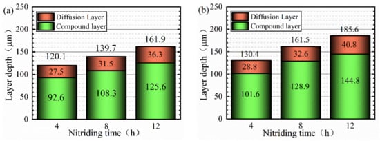 Figure 1a,b are cross-sectional micrographs of 3Cr13 steel after plasma nitriding for 4, 8 and 12 h without and with RE. The nitrided layer is composed of a compound layer and diffusion layer from surface to core. There are distinct boundaries between the compound layer, the diffusion layer and the substrate. The total thickness of the nitrided layer can be obtained according to the microhardness diagrams, the thickness of the compound layer can be obtained according to the ruler in Figure 1, and the difference value is the thickness of the diffusion layer. With the addition of RE, the thickness of the nitrided layer increases with time, and the total thickness of the nitrided layer is 130.4, 161.5 and 185.6 μm, respectively, which is 8.6%, 15.6% and 14.7% higher than that without RE, respectively.