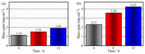 Figure 3a,b are histograms of the weight gain of 3Cr13 steel after plasma nitriding for 4, 8 and 12 h without and with RE. The weight gain of the sample becomes more significant with the extension of time. With the addition of RE, the weight gain of the nitrided layer is very obvious, reaching 2.31, 3.56 and 4.23 mg/cm2, respectively, which is 102.6%, 135.8% and 121.5% higher than that without the addition of RE, respectively.