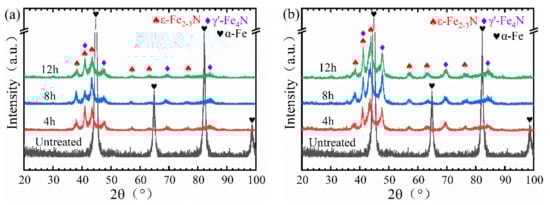 Figure 5a,b are the XRD pattern of the modified layer of 3Cr13 steel after plasma nitriding for 4, 8 and 12 h without and with RE. In Figure 5a, the main phase is ε-Fe2-3N, the secondary phase is γ’-Fe4N. After the addition of La, the intensity of the ε-Fe2-3N diffraction peak is significantly enhanced, and the content of ε-Fe2-3N in the modified layer is greatly increased. Reference [14] shows that ε-Fe2-3N improved the corrosion resistance to a significant extent, and more than that of γ’-Fe4N. At the same time, due to the La atoms dissolving into the nitride layer, the lattice distortion results in increased microhardness [12].