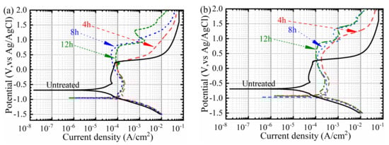 Figure 6a,b display the corrosion resistance curve of 3Cr13 steel after plasma nitriding for 4, 8 and 12 h without and with RE. With or without the addition of RE, the passivation zone of the corrosion resistance curve becomes wider with the increase of time, the corrosion resistance is slightly enhanced.