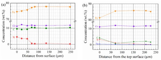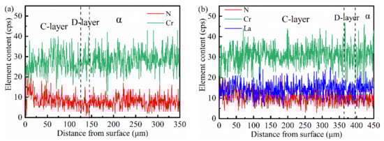 Figure 8a,b are the element depth profile of the modified layer of 3Cr13 steel after plasma nitriding for 12 h, without and with RE. The percentage of La, C and N are measured by linear scanning. As can be seen from Figure 8a,b, the Cr content of both C-layer (0–125.6 μm) and D-layer (0–144.8 μm) increased, while the N content decreased significantly. As shown in Figure 9a, the total diffusion depth increased from 145.3 to 157.9 μm, the contents of Cr and N decreased in the D-layer layer (125.6–145.3 μm), while the contents of Cr and N basically remained unchanged in the D-layer (144.8–157.9 μm) layer in Figure 9b. The La content decreased gradually. The addition of La greatly promoted the diffusion of N and reduced the precipitation of CrN.