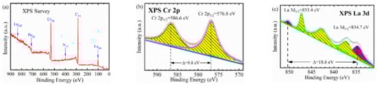 In order to determine the possibility of producing a Cr-N bond on the sample surface under consideration and to study the content of CrN on the surface, the XPS spectrum of a high-resolution Cr2P is shown in Figure 9b. A strong peak (a weak peak) was observed in the XPS spectrum of Cr2P, with a peak position matching the orbital 2P1/2 (586.6 eV) and orbital 2P2/3(576.8 eV) [21].