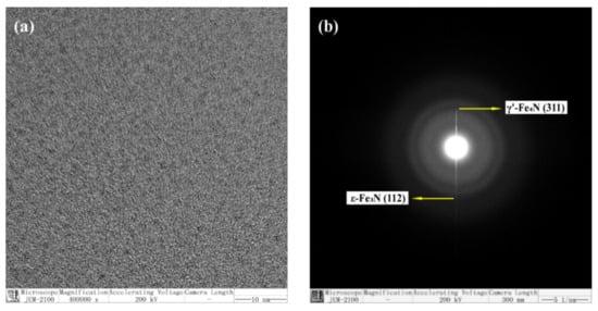 Figure 10a,b show typical transmission electron microscope images and diffraction ring images of nanocrystallization of 3Cr13 steel at 10 μm from the sample surface after RE nitriding for 12 h. According to the scale and the comparison of the standard XRD diffraction peak pattern in Figure 10b, the inner ring corresponds to the crystal plane γ’-Fe4N (311), and the outer ring corresponds to the crystal plane ε-Fe3N (112). The SAED patterns shows that there are a large number of γ’-Fe4N and ε-Fe3N particles. The addition of La can further refine the grain size of the nanocrystalline layer [23], and the results indicate that the addition of La can produce a microalloying effect on the nitride layer of 3Cr13 steel.