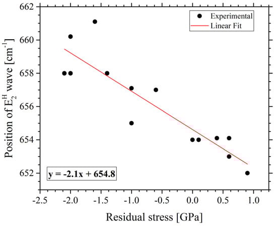 However, the measurement of substrates radius curvature was very significant in order to estimate the internal stress of the film. The thickness was derived from the difference in height between a first area coated with the deposited film and a second which was previously hidden during deposition. Moreover, the residual stress data were coupled with Raman shifts. The variation of the stress as function of the () band shift was linear, as represented in Figure 1 []. For a given position of E2 band, the residual stress was easily deduced.