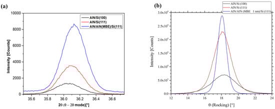 In fact, the Si substrate surface has an impact on the epitaxial growth of AlN, as the chemical contaminants and particulate impurities on the Si surface influence the characteristic of AlN films, and also the device performance and the yield [,,]. For that, the Si surface condition is very important. Generally, the wet etching method is used to clean the Si substrate surface [,,]. The impact of the Si substrate surface on the epitaxial growth of AlN was studied [], but, unfortunately, the mechanism is still not clear. K. Ait Aissa et al. [] showed that the interface between the AlN film and the Si(100) substrate is abrupt, which indicates a local epitaxial growth of AlN on Si(100) deposited by high-power impulse magnetron sputtering (HiPIMS), However, an amorphous intermediate layer was seen in the case of the AlN film grown on Si(100) by direct current magnetron sputtering (DCMS).