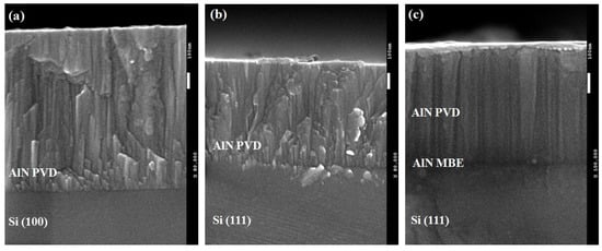 Cross section SEM image for (a) AlN/Si(100), (b) AlN/Si(111) and (c) AlN/AlN MBE/Si(111).