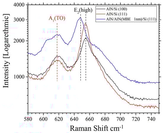 Figure 5 represents the Raman spectra collected at room temperature from all samples. The peaks that are situated at approximately 604 cm−1 (and 655.57 cm−1) for AlN DCMS/Si(100), 654.86 cm−1 for AlNDCMS/Si(111), and 648 cm−1 for AlNDCMS/AlNMBE/Si(111)) are attributed to the A1(TO) and E2 (high) Raman mode of AlN, respectively [] (TO corresponds to transversal optical phonons). The E2 (high) peak became broader in the case of the film AlN deposited by DCMS on a AlN buffer layer on Si(111). The expansion of the E2 (high) peak may be related to the crystalline deterioration or to the intrinsic stress []. However, as the XRD results (Figure 2a,b) validate the high crystalline quality of the AlN deposited films on the AlN buffer layer on Si(111), the theory of crystalline deterioration can be excluded. It can be seen from Figure 5 that the AlN film deposited on the Si(111) substrate is almost relaxed (stress = 0.03 GPa). Nevertheless, for AlN deposited on Si(100), the stress is equal to −0.37 GPa, meaning that the film is in compression. The residual stresses in the films deposited by PVD methods comes from the intrinsic stresses due to defects, lattice mismatch stresses, and thermal residual stress due to coefficient thermal expansion mismatches between substrates and the deposited films. The defects in the deposited AlN films are complex, such as vacancies, dislocations, grain boundary density of the film, impurities, and surface atomic arrangements of the substrates. As both the atomic arrangements of Si(111) surface and AlN (0002) oriented films are hexagonal, vertical columnar growth of the AlN film is observed with minimal residual stress [,]. On the other hand, AlN films deposited on the AlN buffer layer/Si(111) have shown a stress of 3.23 GPa. This result indicates that the film is under tension, which is in good agreement with XRD results.