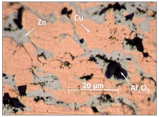 1]. Moreover, alumina particles are also found between the copper ones, but compared to zinc, do not surround copper in the same conformal way due to lack of plasticity. As a result, to get through the wire, an electrical current passes through zinc particles as well. The electrical conductivity of zinc is 3.5 times less than the electrical conductivity of copper. Therefore, the addition of zinc leads to a decrease in the electrical conductivity of the coating. Thus, the microstructure is a key factor for elucidating the emerged problem of changing properties of the coating.