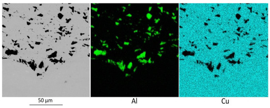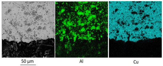 Figure 8 shows a section of a detached coating where alumina particles are observed and do not exceed the separation surface. Therefore, alumina particles embedded in a copper substrate remain there. These particles are located uniformly (