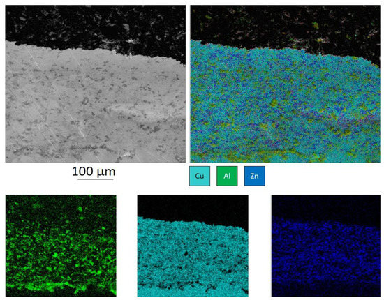 26]. Consequently, zinc particles on impact deform more easily compared to copper particles. Thus, the probability of seizure of zinc particles with the copper substrate will be greater compared to the probability of seizure of copper particles. Simply put, when spraying powder mixtures with zinc, zinc particles are the first to cover the copper substrate, and then the copper particles are bound to the zinc-rich layer [