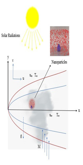 Wahid [28] used the Marangoni flow model to study the influence of suction on mass and heat transport in the nanofluid boundary layer. Hossain [29] analyzed the influence of natural convection on a laminar unsteady fluid moving along a vertical perforated plate in a porous medium. Considering the natural convective flow over an infinite vertical flat plate, Sandeep [30] developed a mathematical model to analyze the influence of thermal radiations on the heat and mass transfer of nanofluids. Considering the natural convective flow of an unsteady MHD nanofluid over an infinite vertical flat plate, Mandal [31] developed a mathematical model to visualize the influence of solar radiation on the characteristics of mass and heat transfer. Later, Daniel [32] studied the influence of chemical reactions, radiation and magnetic fields on the mass and heat transport of dusty nanofluids flowing through a heat-conducting medium. Taking viscous dissipation into account, Ghasemi [33] studied the effect of various physical parameters on the transfer of mass and energy in the boundary layer of a nanofluid flowing through a stretched sheet.