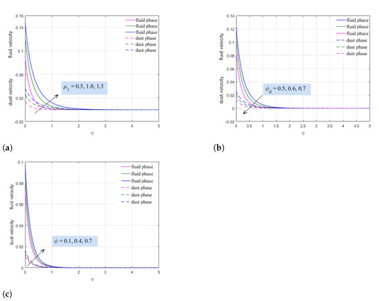 Figure 2a illustrates the influence of ( is the ratio of free-flow viscosity to base fluid viscosity) on the fluid phase velocity profile represented by the solid line and the dust phase represented by the dashed line. By increasing the value of , it makes a significant contribution to the increase in the velocity distribution of the dustless nanofluid, while the contribution of to the stimulation of the velocity of the dusty nanofluid is insignificant. As the value of increases, the thickness of the momentum boundary layer of dust-free and dusty fluids increases. Figure 2b discusses the influence of (the ratio of the volume of nanoparticles to the total volume of the mixture) on the speed distribution of dust-free and dusty nanofluids. When increasing the value of , the velocity distribution of both dust-free and dusty nanofluids will decrease. When improving the value of , the viscous boundary layer thickens slightly, regardless of whether the nanofluid is dust-free or dusty. is the concentration of nanoparticles per unit volume, which influences the velocity profile of dust-free and dusty nanofluids, as shown in the Figure 2c. A small increase in the fractional concentration of nanomaterials can cause a significant improvement in the velocity profile. If the concentration of the nanoparticles per unit volume increases, the penetration depth of the momentum boundary layer increases.