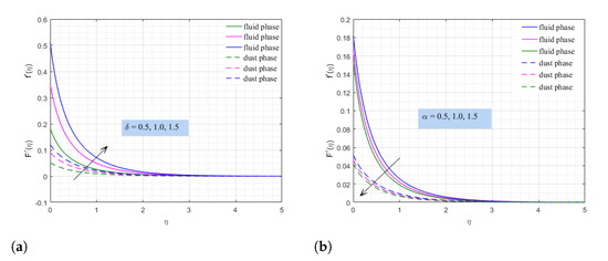 Change in the velocity profile at different values of certain parameters. (a) Change in velocity profile at different values of δ. (b) Change in velocity profile at different values of α.