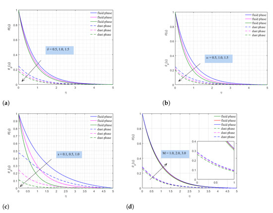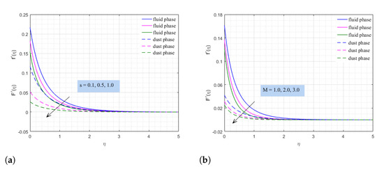Figure 3a examines how the variable surface tension affects the velocity distribution of both the dust-free and the dusty nanofluid. This figure shows that increasing the values of increases the velocity distribution and that the viscous boundary layer becomes thicker in both cases (regardless of whether the fluid is dusty or free of dust). By increasing the mass concentration of nanoparticles , the velocity distribution decreases as expected, as shown in Figure 3b. Moreover, significantly increases the penetration depth of momentum in the dust-free and dusty nanofluid boundary layer. The movement of fluid from the low pressure zone to the high pressure zone is mathematically regarded as suction. The low-pressure zone is called the inlet zone, and the high-pressure zone is called the outlet zone. In such applications, the lowest pressure area needs to be selected. In this study, is regarded as the lowest pressure zone. If liquid enters an area where the pressure is comparatively higher than the area where the liquid was, it means that the suction values are higher. It can be seen from the adjacent figure that the volume of the fluid decreases when it passes through the equilibrium zone, thereby reducing the flow rate, usually reaching a maximum. To see how the suction parameter s affects the velocity in the graph, a graph is shown in the Figure 4a. Due to the increase in the suction parameter value, the speed of the dust and liquid phase on the graph decreases, as can be seen from the adjacent graph. In both cases, the penetration depth of the viscous boundary layer decreases as the suction parameter s becomes larger. Increasing the value of the magnetic field parameter M can significantly reduce the velocity distribution of the dust phase and the fluid phase, and the momentum boundary layer becomes thinner when increasing M, as shown in Figure 4b.
