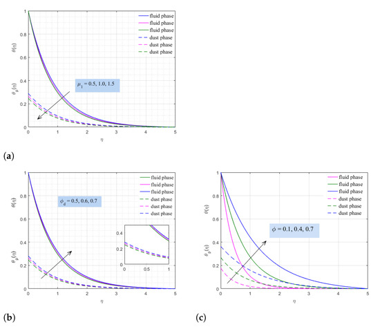 Concentration profiles for different values of parameters. (a) Change in temperature distribution at different μ1 values. (b) Change in temperature distribution at different ϕd values. (c) Change in temperature distribution at different ϕ values.