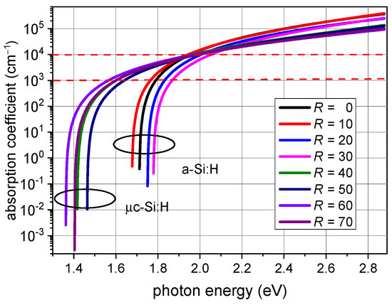 Absorption coefficients in Figure 2 are clearly divided into two groups according to the structure. The transition from a-Si:H to μc-Si:H shown clearly in microstructural characteristics is responsible for this division indicating the threshold of forming crystalline grains and thus material with prevailing crystalline phase under increasing amount of hydrogen at deposition. Due to the crystalline grains in μc-Si:H thin films, internal scattering effect may contribute to the absorption coefficients [24,25].