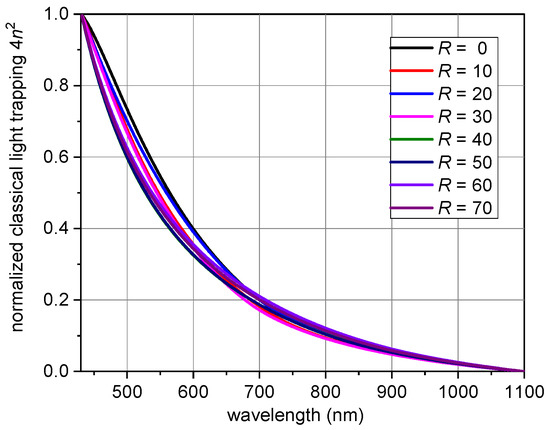 where assumes perfect antireflections and perfect Lambertian light trapping with the limit of the OPL enhancement [27,28]. It can be used to consider the light trapping limit, e.g., in sensing, photodetecting or photovoltaics [33,34,35,36].