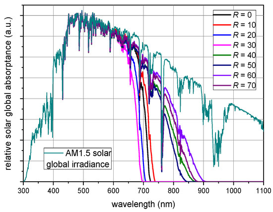 The importance of the direct Yablonovitch absorptance is clearly seen in considering the absorption of solar light in solar cells or sensors based on solar light absorption, e.g., motion sensors. A merit of the suitability of a thin film absorber of solar light is the spectrum of A(λ). is the AM1.5 reference solar global spectral irradiance according to ASTM G173-03 [37]. In solar cells A(λ) is directly proportional to the photo-generated current density and correlating with solar cell efficiency.