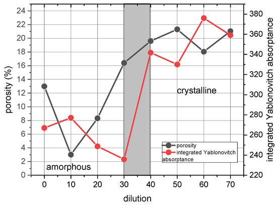 Correlated porosity and the integrated direct Yablonovitch absorptance at the dilutions corresponding to the transition a-Si:H –> μc-Si:H (grey rectangle).
