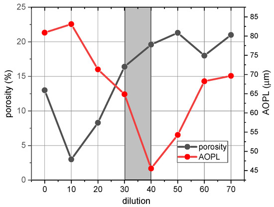 Reverse correlation of porosity and AOPL at the dilutions corresponding to the transition a-Si:H –> μc-Si:H (grey rectangle) and below this region.