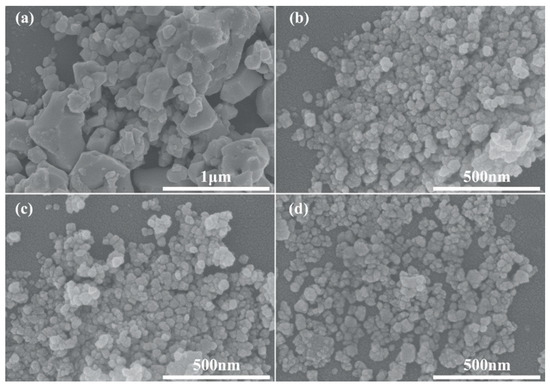 FESEM micrograph of cerium oxide doped with lanthanum at different concentrations: (a) 0 wt.%, (b) 5 wt.%, (c) 10 wt.% and (d) 15 wt.%.